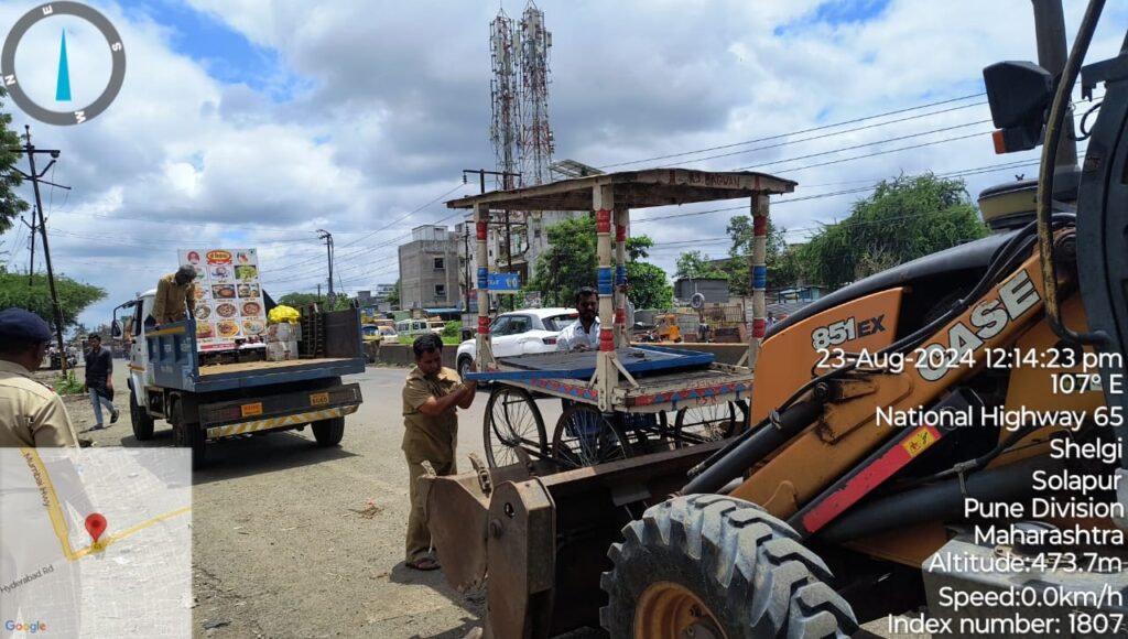 महापालिका आयुक्त शीतल तेली – उगले यांच्या आदेशानुसार उपायुक्त मच्छिंद्र घोलप यांच्या मार्गदर्शनाखाली सोलापूर शहरात रहदारीस अडथळा ठरणारे तसेच फुटपाथवरील अतिक्रमण हटविण्याची मोहीम नियमितपणे सुरू आहे. या मोहिमेअंतर्गतच आज सोलापूर शहरातील गजबजलेल्या अशा हैदराबाद रोड , मार्केट यार्ड परिसरातील रस्त्यालगतचे अतिक्रमण काढण्यात आले.